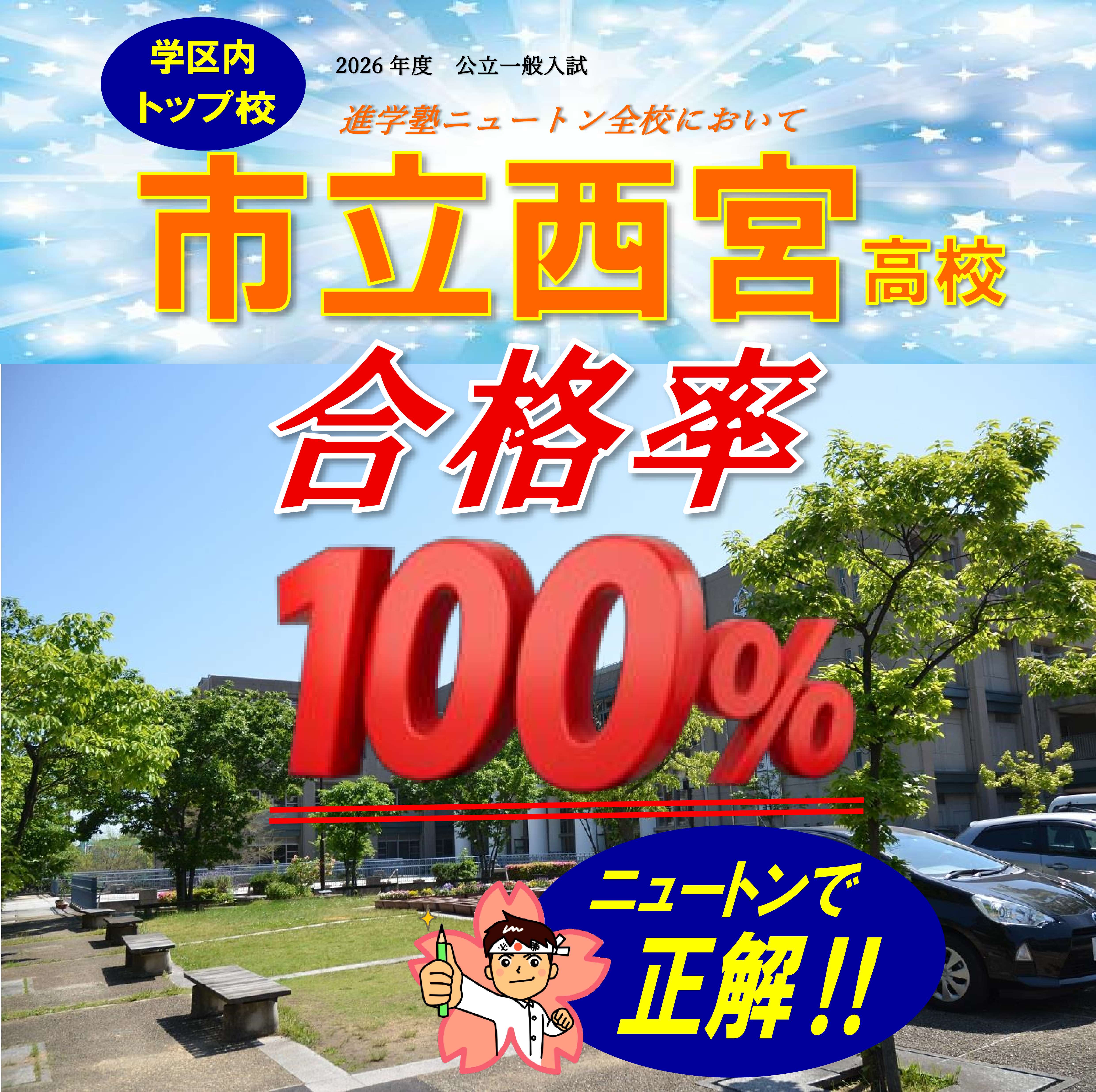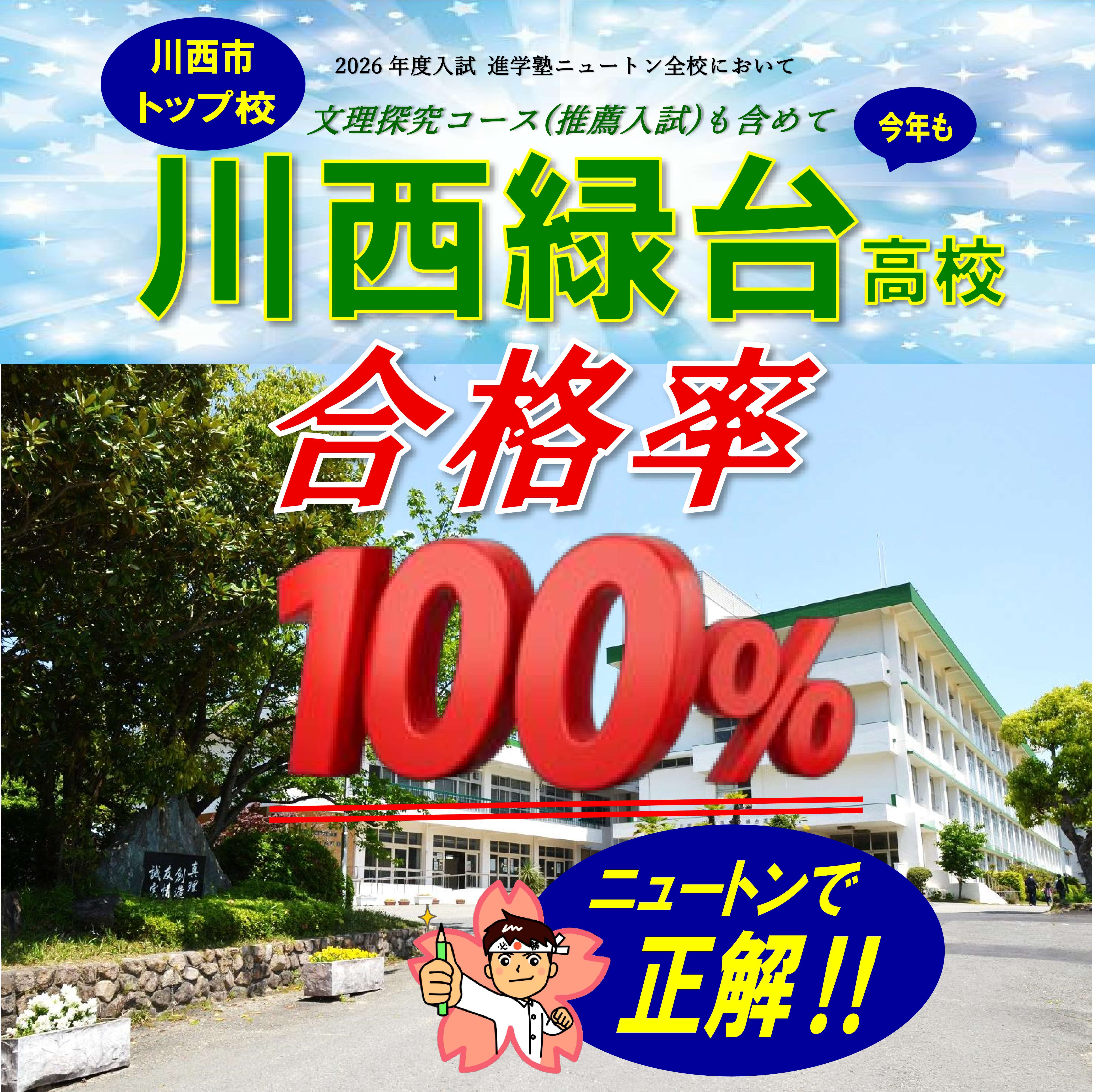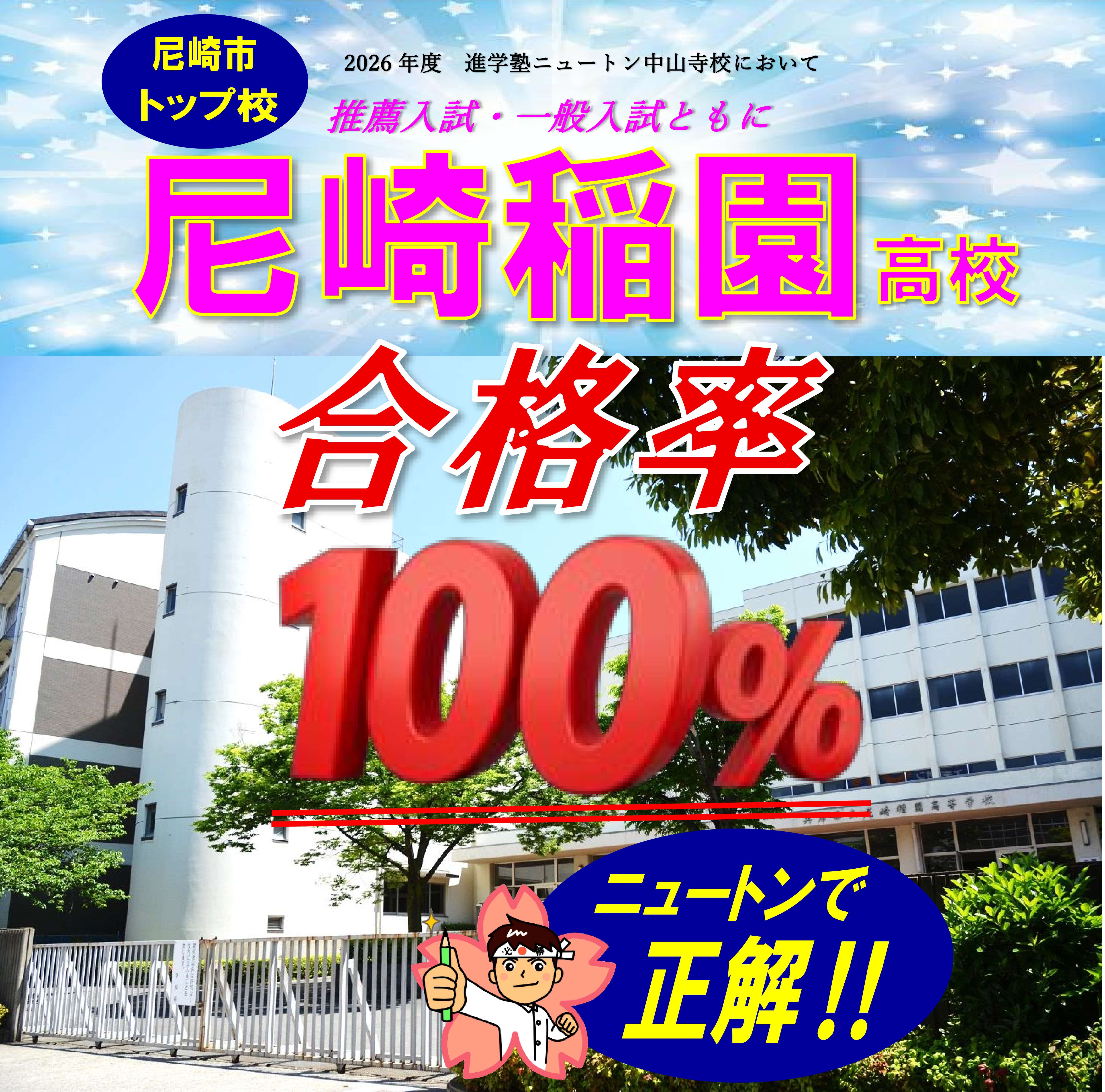 また、進学塾ニュートン中山寺校において、尼崎市のトップ校である「尼崎稲園高校」を受検した生徒さんは、推薦入試・一般入試ともに全員合格しました。川西能勢口校においても、尼崎稲園高校の一般入試において、受験生全員が合格を果たしました! 受験生の皆さん、本当におめでとうございます! 改めて、進学塾ニュートンの合格率の高さ・受験対策の精度の高さが証明される結果となりました。