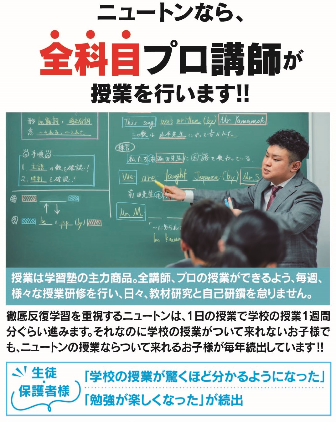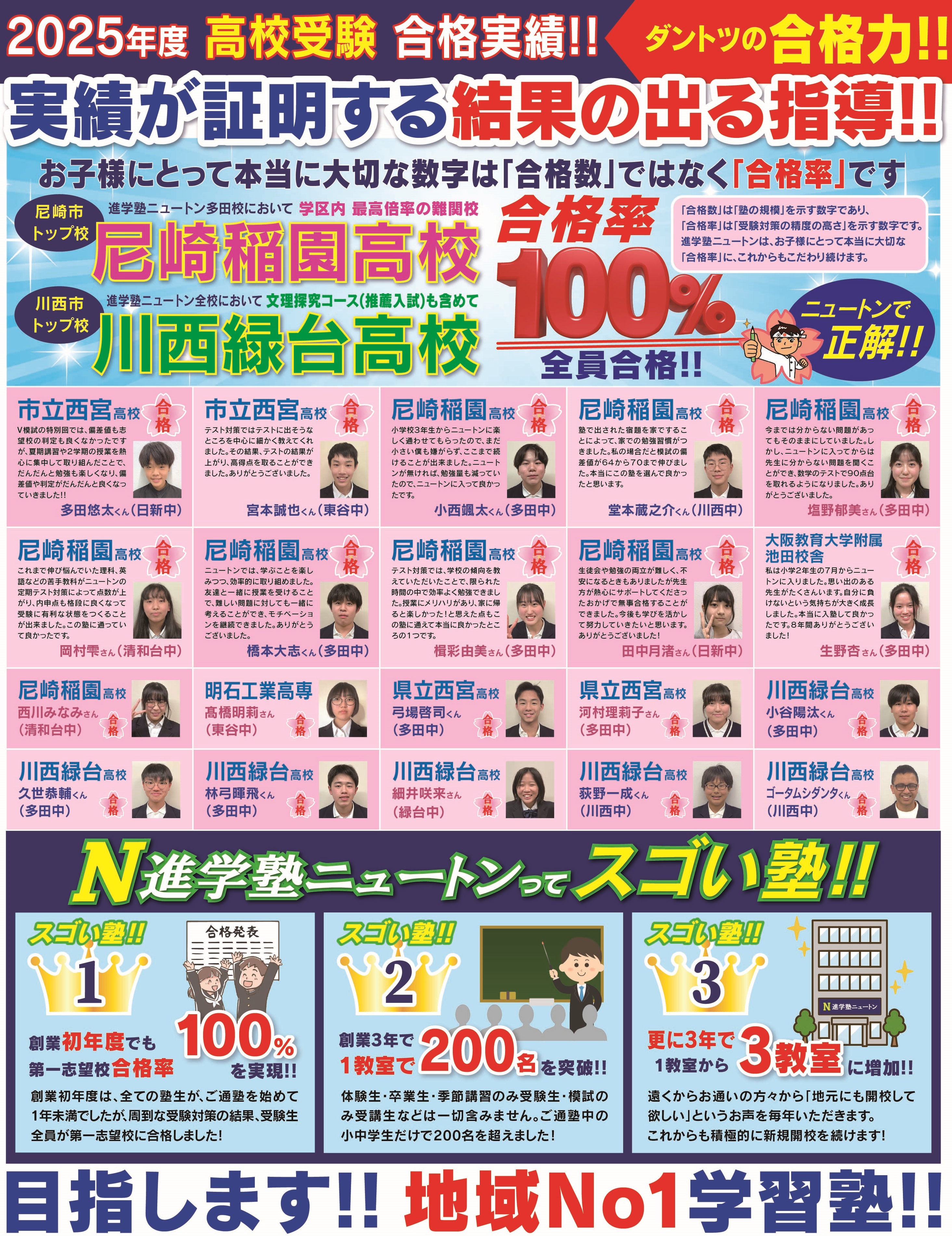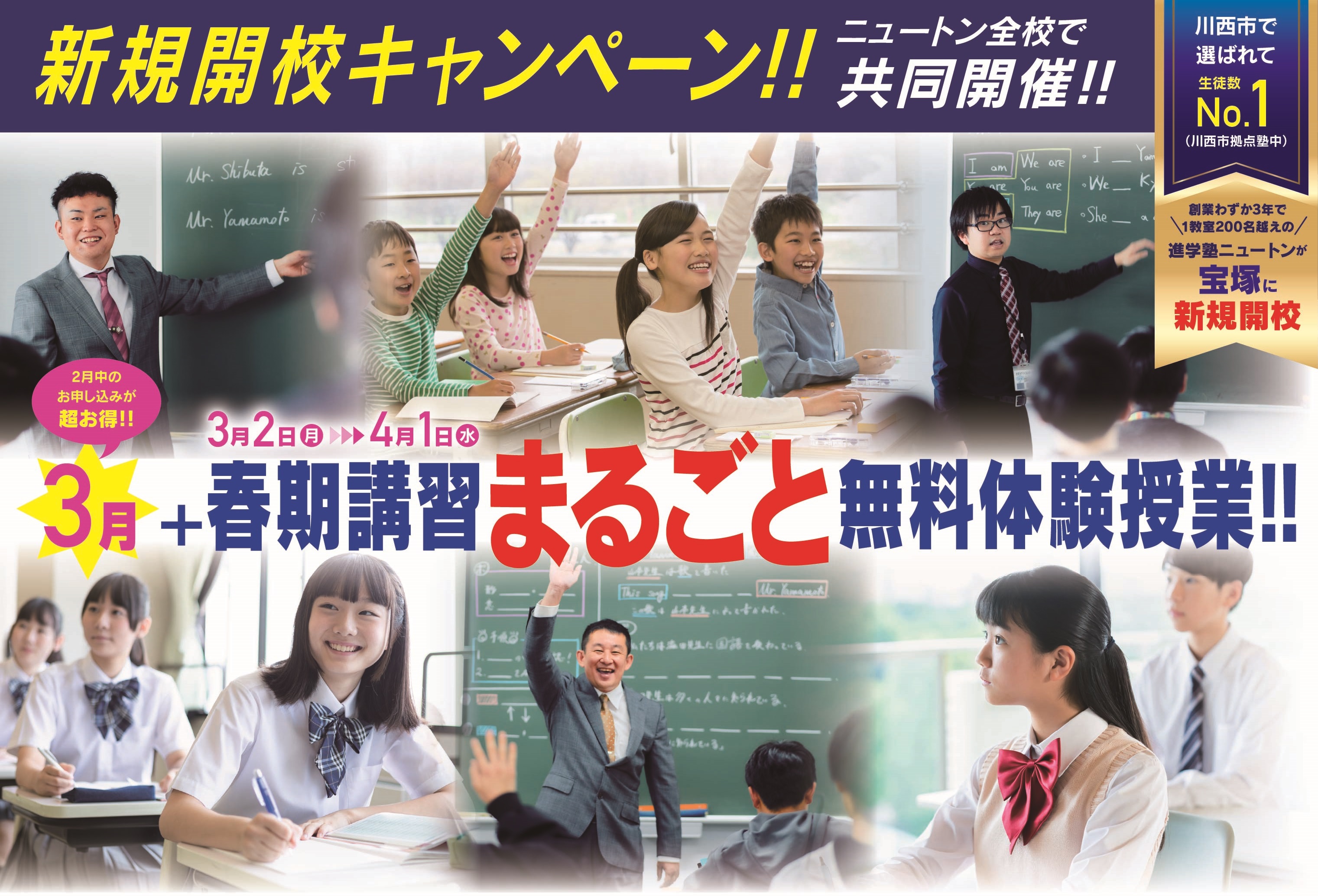 川西市 宝塚市 尼崎市塚口にある進学塾ニュートンは、創業から10年未満の新しい塾なのに、川西市内で選ばれて、川西市拠点塾中「生徒数No1」となりました! 進学塾ニュートンには、精鋭講師が終結! 情熱たっぷりの熱血指導でお子様の成績をグングン伸ばします! ぜひ進学塾ニュートンの無料体験授業をお試し下さい!