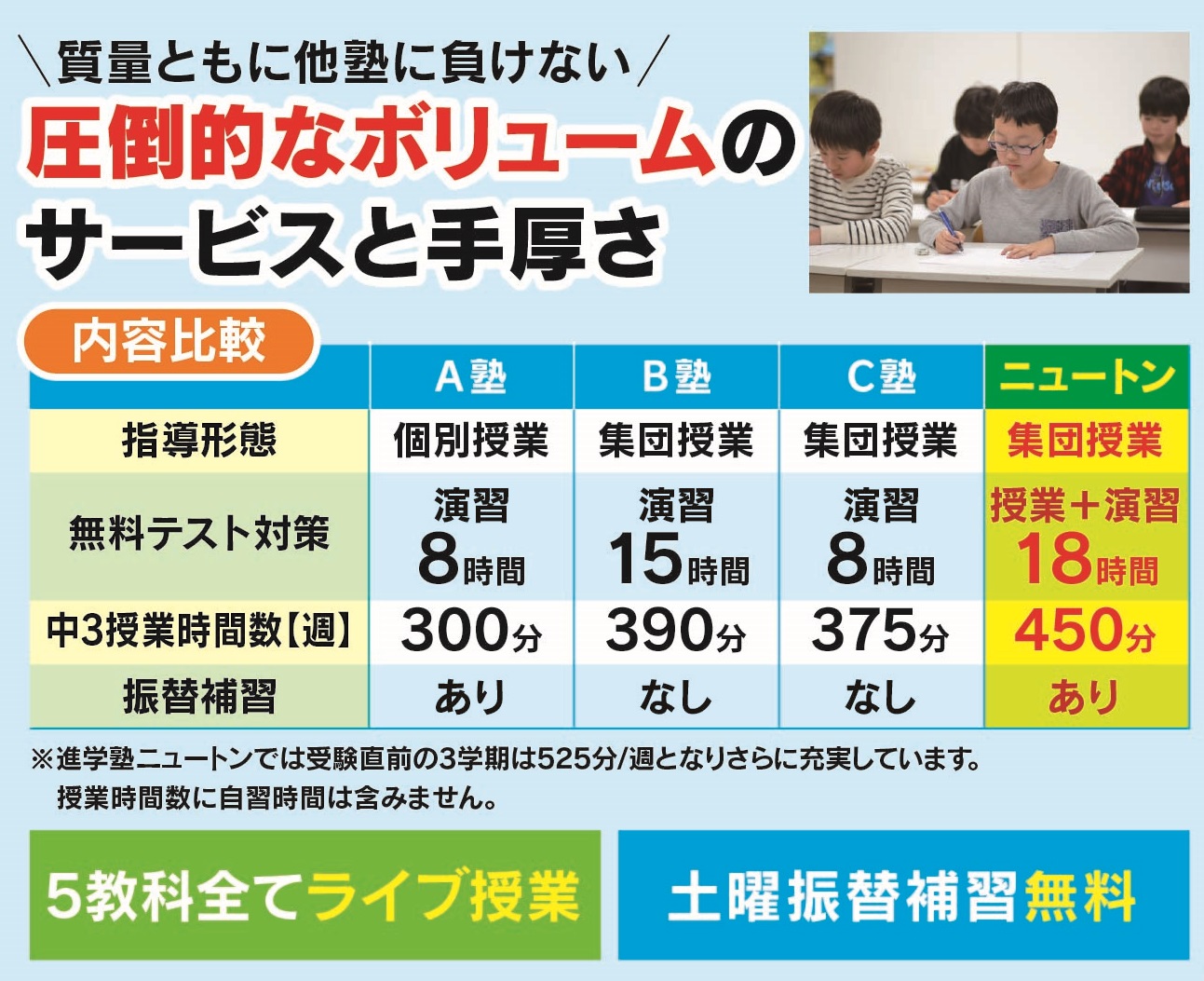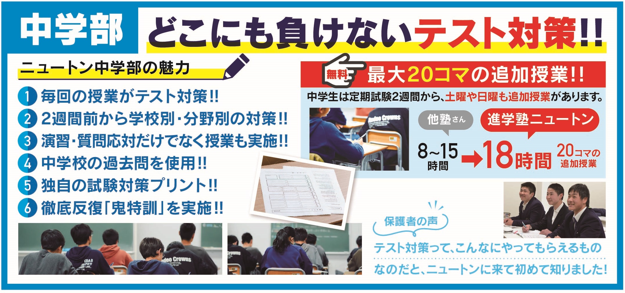 試験2週間前になりましたら、学校別・分野別に授業形式で実施。それに加えて、合計20授業コマという他塾さんには負けない圧倒的なボリュームの補習を、テスト前には無料で追加します!